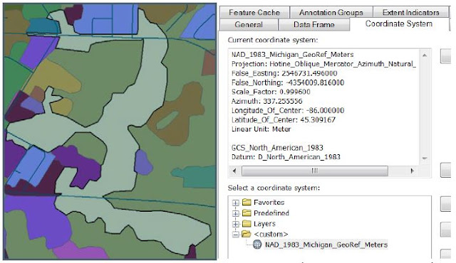 1. Prepare your features in which sampling will occur. This should be a polygon feature class (e.g., soils, vegetation, or ownership polygons). It will be simplest if the features in which you wish to sample are in their own layer. Add the polygon layer to a new map document and verify that the coordinate system / map projection for the data frame is set correctly.