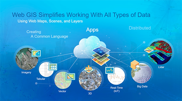 Plus concrètement, concernant l'implémentation de cette vision "The Science Of Where", Jack Dangermond a pris le temps d'expliquer que cela passe par une nouvelle architecture des SIG qu'Esri appelle, depuis plusieurs années déjà, le SIG Web. Le Web GIS (en anglais) ne consiste pas à exposer une partie de son SIG sur le web (ça c'est le SIG des années 2000) mais bien d'utiliser les technologies et les architectures découlant du web (navigateurs, mobilité, web apps, développements cross-platform, webGL, virtualisation des serveurs, architecture distribuées, cloud, scalabilité, ...) pour construire son SIG.