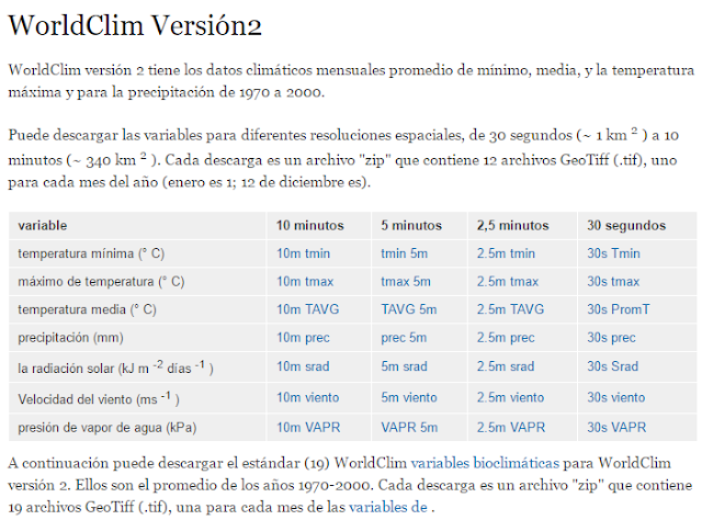 WorldClim es un conjunto de capas de clima global (datos de clima cuadriculada) con una resolución espacial de 1 km aproximadamente 2 . Estos datos pueden ser utilizados para el mapeo y modelado espacial.