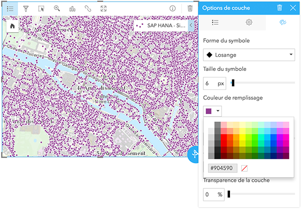 Des améliorations ont été apportées pour vous permettre une plus grande maîtrise sur l'aspect de vos cartes. L'interface de légende vous donne dorénavant la possibilité de modifier une couleur en spécifiant un code hexadécimal.