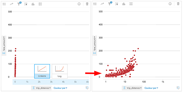 Certains types de diagrammes comme les nuages de points offrent la possibilité de modifier les échelles des axes pour les passer de linéaire à logarithmique. Cette option est particulièrement utile si vos données s'étalent sur des plages de valeurs importantes.