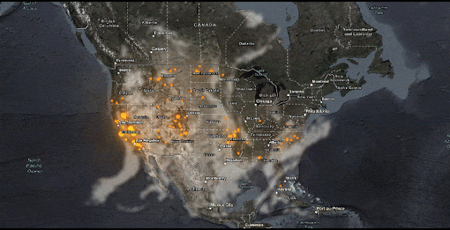 Cet effet produit des zones lumineuses autour des entités de la couche. Vous pouvez ajouter ainsi une lueur à vos couches pour des cartographies d'incendies, d'éruptions volcaniques, de points d'éclairages ou pour mettre en évidence des entités sur lesquelles vous souhaitez attirer l'attention (comme dans cet exemple mis à jour qui montre les empreintes de bâtiments de New York par année de construction). Vous pouvez combiner plusieurs effets sur une même couche et utiliser des effets similaires ou différents sur plusieurs couches d'une même carte. Dans la carte ci-dessous, les emplacements de feu actifs ont un effet de floraison tandis que la couche de fumée a plusieurs effets, y compris le flou pour une limite floue.