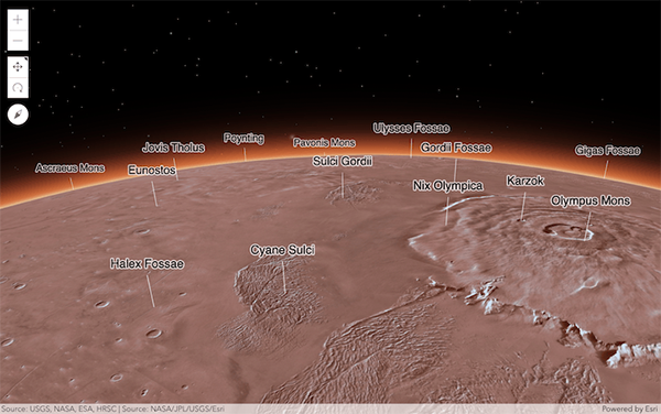 On peut clairement dire que l'API couvre de nouveaux espaces dans cette dernière version ! En effet, vous pourrez désormais utiliser l'objet SceneView pour exploiter les fonds d'imagerie et les couches d'élévation de la Lune et de Mars, mais également vos couches contenant des informations cartographiées sur ces deux corps célestes. L'atmosphère et les dimensions physiques utilisées dans les outils interactifs tels que les mesures sont automatiquement ajustées lors du chargement d'une couche avec un système de coordonnées extraterrestre pris en charge.