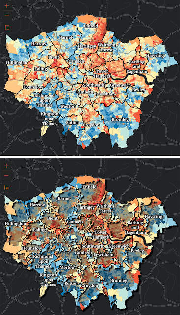 Les captures d'écran suivantes montrent la même carte, avec et sans effets. En bas, l'ombre portée est appliquée aux entités qui croisent les limites des arrondissements de Londres, tandis que les effets de flou et de luminosité (réduite) sont utilisés pour désaccentuer les entités ne répondent pas à ces critères. La carte (inspirée de ce tweet ) montre l'indice global de privation multiple en 2019 subie par les personnes vivant dans la région du Grand Londres.