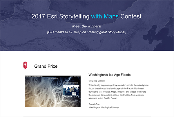 Cette semaine, conférence mondiale des utilisateurs Esri oblige, je n'ai pas eu le temps de parcourir et choisir une Story Map. En revanche, dans le cadre de la UC Esri, un concours de Story Map (2017 Esri Storytelling with Maps Contest) été organisé. Très riche et de haute qualité, je vous recommande de jeter un coup d'oeil sur le lauréat (Grand Prix) et les lauréats des différentes thématiques.