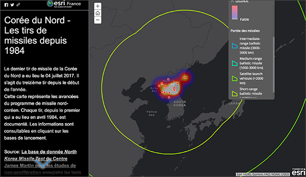 La confirmation par les Etats-Unis le 5 juillet dernier du lancement du premier missile balistique à longue portée par les nord-coréens a ravivé la crainte d’une menace nucléaire dans cette région du globe. Après 13 tirs depuis le début de l'année, Pyongyang a menacé il y a quelques jours de tirer des missiles près de l’île de Guam, tandis que le président américain a promis au régime nord-coréen le "feu et la fureur". Cette nouvelle escalade est l'occasion de mettre en avant cette Story Map réalisée par un de mes collègues d'Esri France il y a quelques mois. Cette dernière représente les avancées du programme de missile nord-coréen.