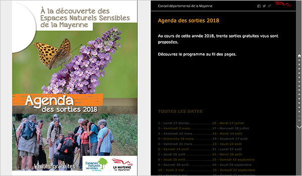Réalisée à l'aide du modèle d'application Story Map Journal, l'application permet de dérouler l'agenda des 30 sorties programmées par le département et de découvrir les lieux, l'écosystème et les spécificités du site visité.