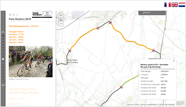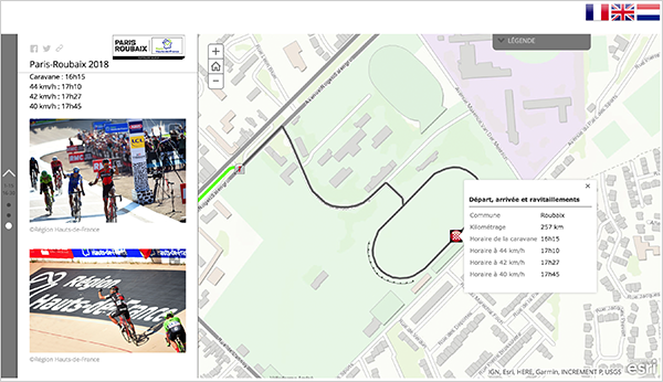 D'un point de vue technique, cette Story Map est basée sur le modèle d'application Story Map Journal d'ArcGIS Online. Il a été téléchargé, configuré, personnalisé puis hébergé sur les serveurs de la région Hauts-de-France). Exploitant les capacités d'hybridation de la plateforme ArcGIS, l'application affiche des contenus (cartes et couches web) hébergés sur ArcGIS Online. La narration cartographique "Paris-Roubaix 2018" est accessible en 3 langues: français, anglais et néerlandais.