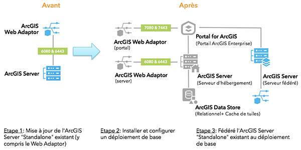 Le dernier scénario est le plus complet et apporte un compromis par rapport aux deux précédents. Il consiste tout d'abord à mettre à jour votre ArcGIS Server "Standalone" en version 10.5 ou supérieure. Ensuite, l'idée est de créer un nouveau déploiement de base ArcGIS Enterprise sur une nouvelle infrastructure (une ou plusieurs machines). La dernière étape consiste à fédérer l'ArcGIS Server "Standalone" à votre site ArcGIS Enterprise afin d'utiliser le même système d'identification des utilisateurs et partager ainsi les ressources de votre ArcGIS Server "Standalone" sur le portail ArcGIS.