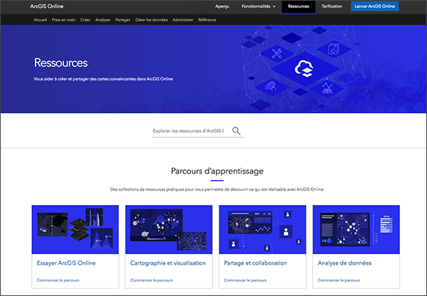 Une nouvelle série de pages intitulées "Parcours d'apprentissage" regroupent des leçons et des exercice pour prendre en main ArcGIS Online