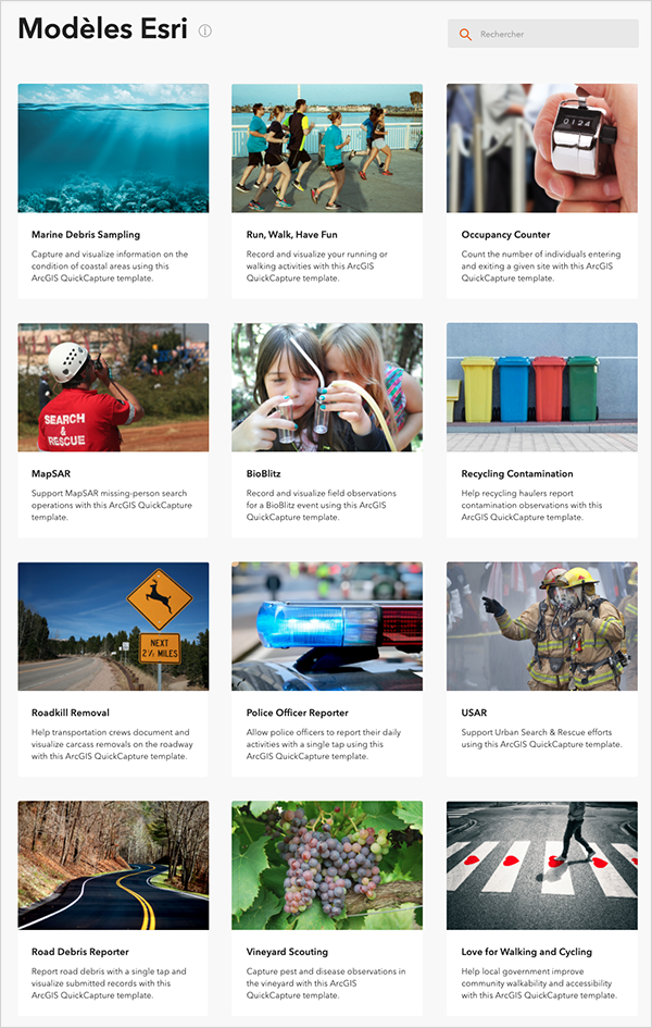 Vous noterez également que tous les modèles QuickCapture incluent des tableaux de bord et des vues de couches prêts à l'emploi. En tant qu'administrateur de votre organisation, vous pouvez également configurer vos propres modèles pour une utilisation par d'autres concepteurs de projets QuickCapture.