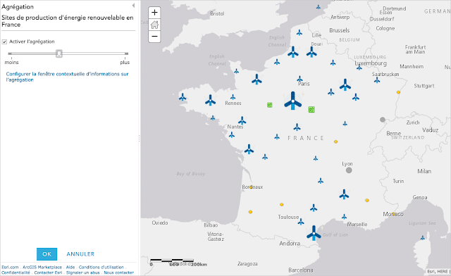 8. Une fois les propriétés d'agrégation définies, vous cliquerez sur le bouton "OK" pour valider vos choix. Le mécanisme d'agrégation peut également s'appliquer à des styles de rendu plus évolués. Par exemple ici, on a décidé de représenter les sites avec différents symboles en fonction du type de production d'énergie (éolienne, hydraulique, géothermique, ...). Pour cela désactiver l'agrégation puis modifier la symbologie de la couche comme vous le faites habituellement.