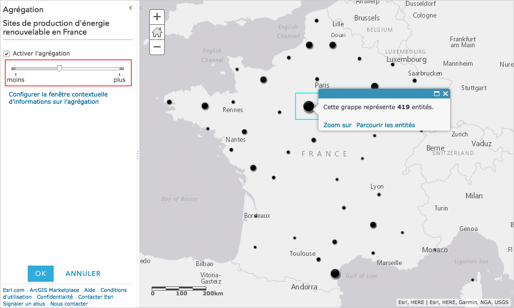 7. Automatiquement, le rendu de la couche de points est modifié. Vous voyez désormais des grappes de points avec un symbole dont la taille est fonction du nombre de sites regroupés dans ces grappes. Ce regroupement est calculé à la volée à chaque affichage et varie donc pour chaque étendue et chaque niveau d'échelle. Vous pouvez alors déplacer le curseur pour changer la distance de recherche pour l'algorithme de regroupement. En cliquant sur une grappe, vous saurez combien d'entités ont été regroupées et le lien "Parcourir les entités" vous permettra même d'afficher les points un par un (attribut et localisation).