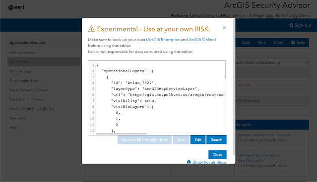 La nuit prochaine aura lieu la 4ème et dernière mise à jour d'ArcGIS Online de l'année 2020. Comme évoqué à plusieurs reprises (en février et puis en juin) sur ce blog, une des évolutions importantes concerne le passage exclusif de la plateforme ArcGIS Online en mode "HTTPS Only". Pour les organisations qui n'ont pas encore activé ce mode (c'est le mode par défaut pour tous les abonnements souscrits à partir de mi-septembre 2018), cela veut dire que certains contenus (application web, services web, documents, images, tuiles de cache, ...) peuvent encore être référencés avec des URL en HTTP et non en HTTPS. A partir de demain, ces contenus ne seront plus accessible depuis le portail ou les apps du portails ArcGIS Online. Il faut donc identifier ces ressources et mettre à jour leur URL en utilisant par exemple l'outil "Security Advisor" présenté dans mes précédents articles sur ce sujet. La version de novembre 2020 de "Security Advisor" s'est concentré sur la fourniture d'un éditeur dans l'outil "HTTP Check" qui vous permet plus facilement de mettre à jour les références HTTP qui sont définies dans les descriptions JSON des éléments de votre portail. Pour mémoire, le moyen le plus direct d'accéder et d'utiliser Security Advisor est à partir du Trust Center ArcGIS. Les évolutions récentes du vérification HTTP sont les suivantes: