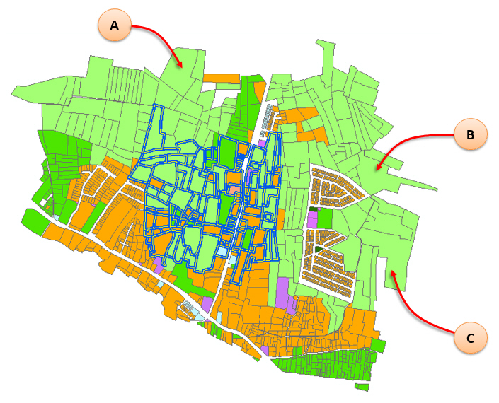 | Polygon berkeluasan kurang dari 2000 m square dibuang dari result selection sedia ada (bulatan merah) |