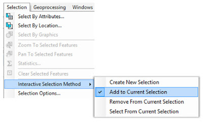 Jadi, cara yang senang, kita setkan kaedah selection kepada Add to Current Selection. Oleh sebab saya nak select polygon A, B, C tu dengan cara klik di atas map, jadi saya kena setkan dalam menu Interactive Selection Method,.. seperti di bawah ni.