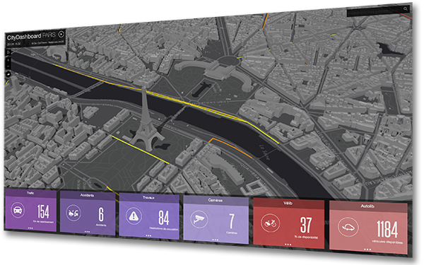 Lors de la session plénière de la conférence SIG 2017, j'ai eu l'occasion de présenter une application web nommée CityDashboard, démontrant notamment ces capacités. Avec cette application, je souhaitais montrer, à travers un exemple concret sur Paris, la création d'interface modernes et efficaces (avec l'API JavaScript 4.x d'ArcGIS), le streaming d'importants volumes de données 3D sur le web (avec un portail ArcGIS) ainsi que l'intégration et la diffusion de flux de données temps-réel (avec ArcGIS Enterprise et son composant GeoEvent Server).