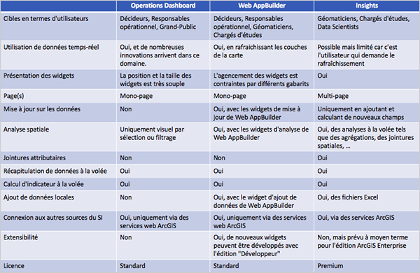 Selon les utilisateurs ciblés, le caractère temps-réel des données et les fonctionnalités d'analyse et de combinaison attendues, vous aurez donc le choix entre ces trois applications web configurables (ou éventuellement d'autres modèles d'application de la plateforme ArcGIS). Pour vous aider à faire le choix, j'ai réalisé le tableau de synthèse ci-dessous: