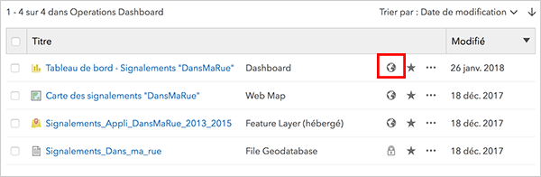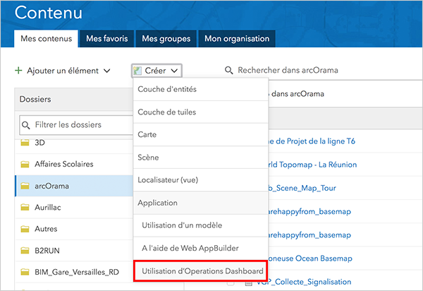 Les tableaux de bord sont des applications configurables de votre portail que vous pouvez créer, comme n'importe quel élément, à partir de l'onglet "Contenu". Vous pourrez également créer un nouveau tableau de bord à partir d'une carte web. Autre possibilité, vous pouvez lancer l'application Operations Dashboard depuis le lanceur d'applications du portail.