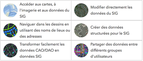 - Permettre à l'utilisateur AutoCAD de saisir des données géométriques et attributaires structurées (modèle de classes d'entités SIG) dans son fichier DWG qui est alors directement importable en Géodatabase, sans changer ni les workflows ni les outils du dessinateur AutoCAD.