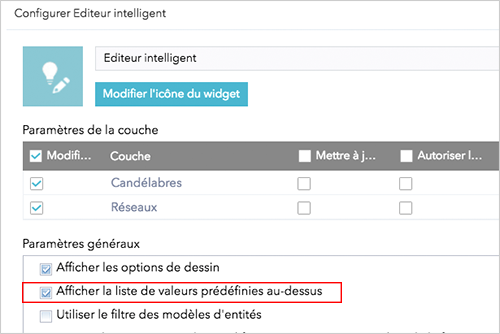 Lorsque l'utilisateur ajoute une nouvelle entité, la fenêtre de l'éditeur intelligent affiche la liste des attributs afin que ce dernier saisisse les valeurs de cette nouvelle entité. Une nouvelle option "Afficher la liste de valeurs prédéfinies au-dessus" permet d'afficher systématiquement la liste des attributs en haut de la fenêtre du widget même si aucun modèle d'entité n'est encore sélectionné.