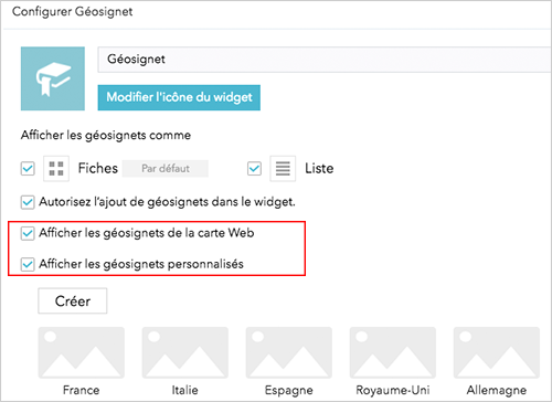 Vous pouvez maintenant indiquer si le widget affiche ou pas les géosignets définis dans la carte web ou les géosignets personnalisés définis pour l'application.