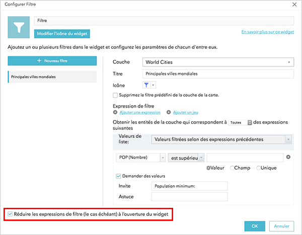 Par exemple, le filtre configuré ci-dessus contient 2 expressions. Avec l'option "Réduire les expressions de filtre...", l'interface du widget se présentera comme ci-dessous.