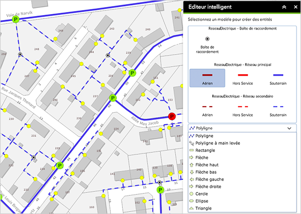 Le modèle d'entité sélectionné dans le cas ci-dessous a une géométrie linéaire, les différents outils de construction de polyligne sont proposés à l'utilisateur.