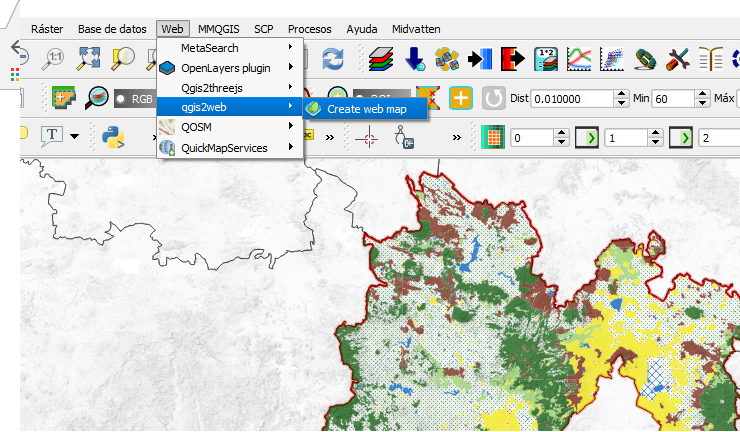 Esta herramienta es muy fácil e intuitiva, sólo tienes que armar tu proyecto, con las capas que quieres mostrar, la simbología deseada, base map e información que quieres mostrar en popup, una vez que tienes tu proyecto guardado tienes ya casí el 80% del trabajo hecho. Después sólo haz click en el botón que ves en la imagen de arriba llamado "qGis2Web" después en Create Web Map. y aparecerá la siguiente ventana emergente.