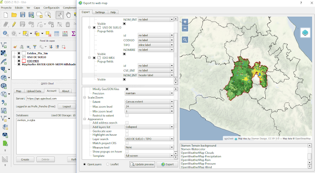 En la opciones Data export deberás decidir sí sólo quieres guardarlo en tu computador ( Haz click en los puntos suspensivos e indica la carpeta en dónde quieres guardarlo) como archivo HTML para posteriormente compartir o montarlo en tu web (cargar el archivo index.html y las carpetas asociadas al directorio principal index.html) o directamente en un FTP Site, ojo a pesar de que no montes el mapa en una web, este será de mucha utilidad ya que podrás enviar tu información (mapa web) mediante correo electrónico, usb, wetransfer, drive, etc. para que otra persona pueda visualizar y análizar la información sin necesidad de un SIG, internet o un computador potente, quieres saber cómo se vería sólo haz click aquí y descarga este ejemplo del uso de suelo del estado de México escala 1: 100,000 .