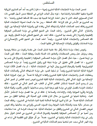 The research includes the study of water needs for the project (Heraea - Daghara), which is one of the most important projects of irrigation and development ,that includes its both branches : social and economic the reason of the importanc of this project is owing to that it represent an agricultural side in regjon into flood plain which is dry desert climate . That climate can not be depended on rain-fed agriculture . In accordance with mentioned above , the project is a base of agriculturl flourishment for that region . The research interviews water needs for the project , to state water losses and cansuptions , in additio to irrigation efficiency. That means there is an overall water balance between water amount and wholly water needs . The research adopted on the official curriculum to study geographical charachteristics (natural and human) of the project . Also , it depends on analytic method to describe the correlation between these charachteristics and the water need of the project . on the other hand , it adopted on the quantitive approach method (EMI) in the study of equations , laws and statistical data for requested research .