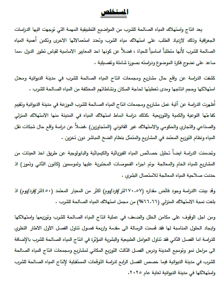 There fore , to find the problems and the weakness in the whole of the process of the drinking water production process in different stages including the treatment , transportation and the consumption and find the Suitable Solutions for them ,this thesis has been introduced .The thesis consisting of an introduction and four chapters .The first chapter has been included the theoretical framework two has been studied the natural and human factors that effect the drinking water production in addition of the extension stage of the city . chapter three has been spatial distribution of the water production project depending on their location in the AL- Diwaniyah city and their effects .chapter four has show some of the future forecasting and consumption for the drinking water production in the AL- Diwaniyah city until 2025 .