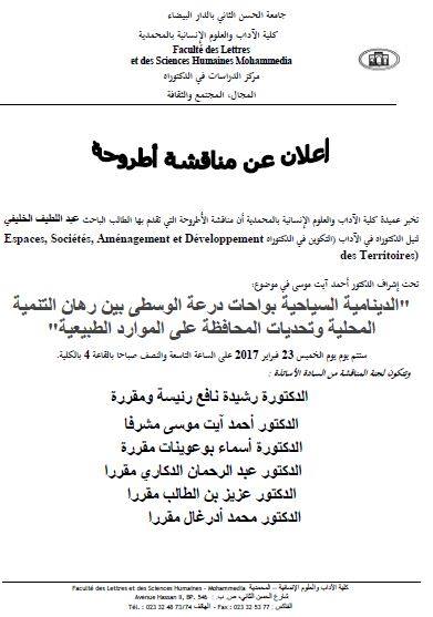 الدينامية السياحية بواحات درعة الوسطى بين رهان التنمية المحلية وتحديات المحافظة على الموارد الطبيعية -مناقشة أطروحة - الطالب الباحث عبد اللطيف الخليفي