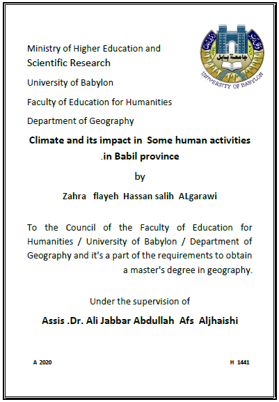 To the Council of the Faculty of Education for Humanities / University of Babylon / Department of Geography and it's a part of the requirements to obtain a master's degree in geography.