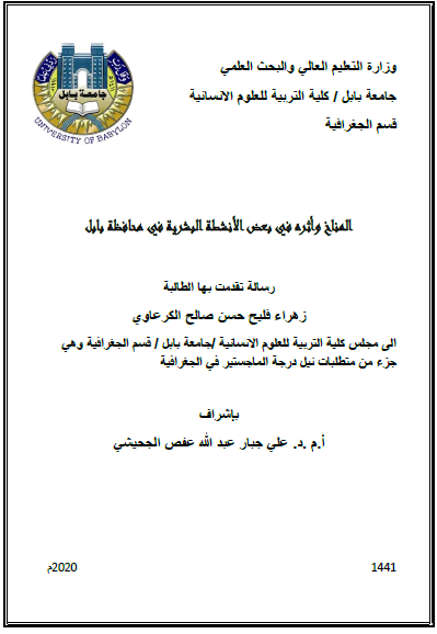 [h=1]المناخ وأثره في بعض الأنشطة البشرية في محافظة بابل - زهراء فليح حسن صالح الكرعاوي - رسالة ماجستير 2020م[/h]