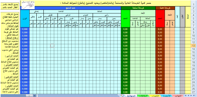 أقدم لكم برنامج حصر الكميات و هو ملف اكسيل رائع جدا يستخدم فى حصر الكميات و حساب الكميات الخاصه بالخرسانة العادية و الخرسانة المسلحة فى القواعد العادية و المسلحة والأساسات و القواعد و غيرها