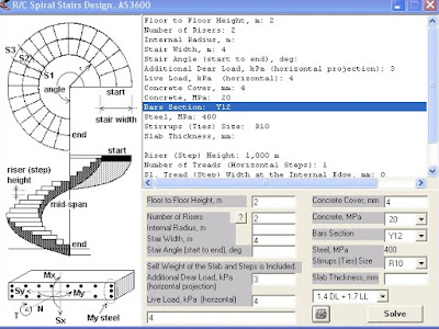 و قصد مساعدة جميع المهندسين في تصميم السلالم أشارككم هذه البرنامج المساعدة لتصميم الدرج الحلزوني - spiral stair و الخاص بتصميم الادراج الحلزونية أو الدائرية حيت يلزمك فقط ادخال بعض المعلومات الانشائيه الخاصه بالسلم ويعطى لك قيم العزوم والتسليح...