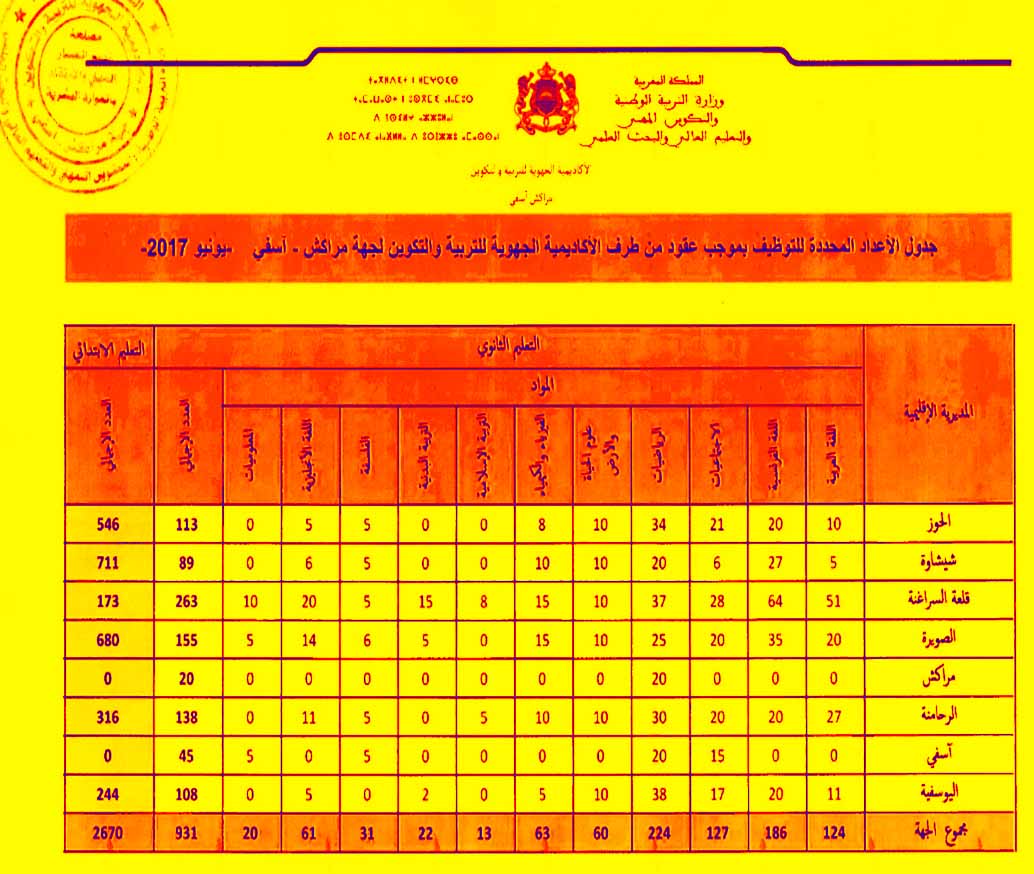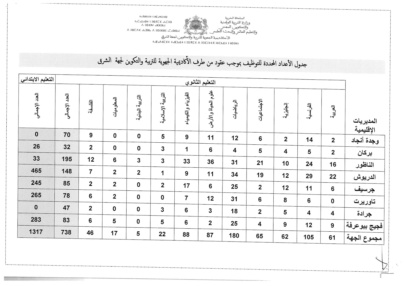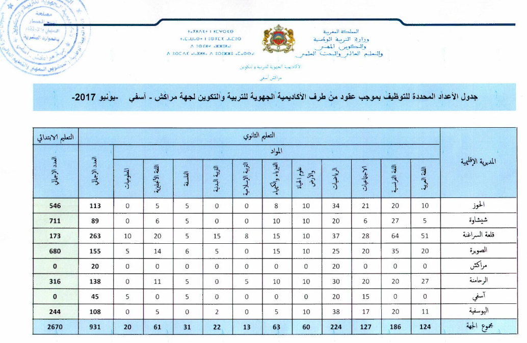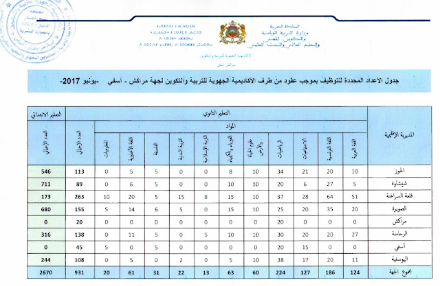 [h=3]جدول الأعداد المحددة للتوظيف بموجب عقود من طرف الأكاديمية الجهوية للتربية والتكوين لجميع الأكاديميات والجهات آخر أجل هو 21 يونيو 2017[/h]