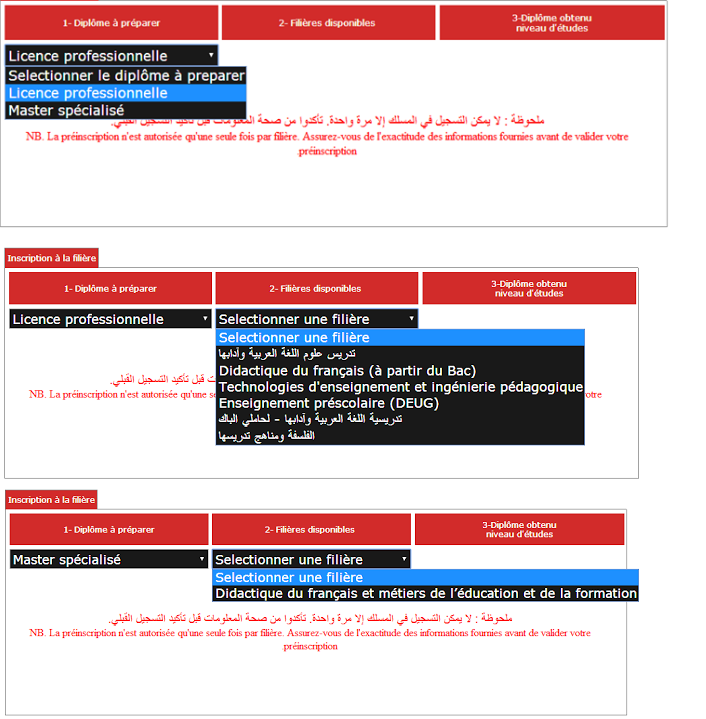 NB. La préinscription n'est autorisée qu'une seule fois par filière. Assurez-vous de l'exactitude des