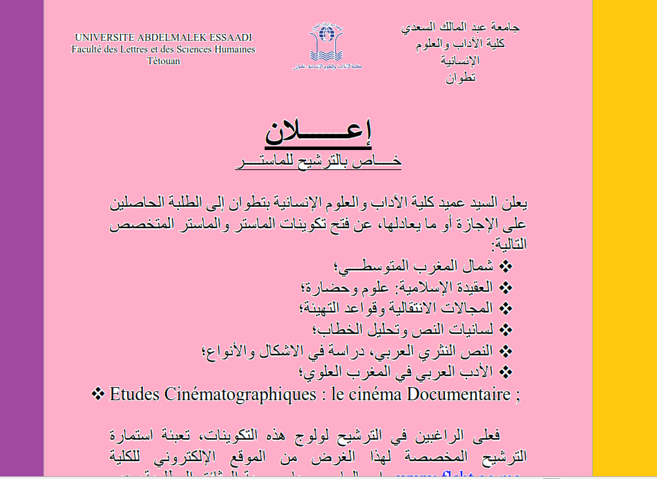 فتح 12 ماستر إعلانخاص بالترشيح للماستر كلية الآداب والعلوم الإنسانية تطوان يعلن السيد عميد كلية الآداب والعلوم الإنسانية بتطوان إلى الطلبة الحاصلين على الإجازة أو ما يعادلها، عن فتح تكوينات الماستر والماستر المتخصص