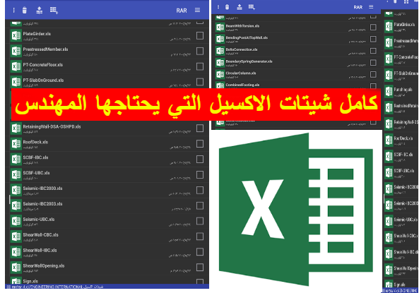 مجموعة كبيرة جدا من شيتات الاكسيل للمهندس المدني بمختلف الأكواد العالمية لتصميم القطاعات و العناصر الإنشائية المختلفة الخرسانية منها و الحديدية ستيل بالإضافة إلي تصميم الطوب المباني و الخشب و التصميم باعتبار قوي الزلازل و الرياح و تصميم الخرسانات سابقة الإجهاد و الكمرات و القواعد المسلحة بأنواعها المختلفة و الأعمدة و الأسقف.