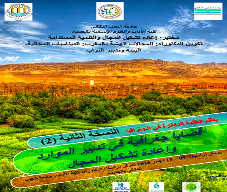 في إطار الأنشطة العلمية التي دأبت شعبة الجغرافيا على تنظيمها بكلية الآداب والعلوم الإنسانية جامعة أبي شعيب الدكالي بالجديدة، يعلن مختبر إعادة تشكيل المجال والتنمية المستدامة عن تنظيم النسخة الثانية لليومين الدراسيين للطلبة الدكاترة الجغرافيون تحت عنوان: