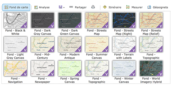 Au delà de ces 9 styles officiels, vous pourrez également utiliser 9 styles supplémentaires qui peuvent présenter un intérêt pour construire des cartographies plus originales. Pour les découvrir, j'ai rassemblé les 18 styles dans l'application interactive ci-dessous.