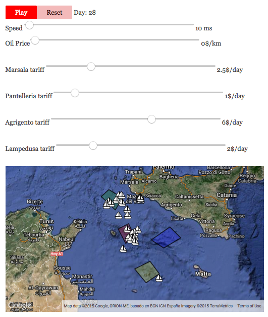 Sharing agent-based models over the web is never very easy. You can do it with NetLogo but it requires that your web browser supports Java 5 (but this is not recommended). One could create a jar file for your model if you are using MASON, for example. But this still requires a number of steps before you see the model running. One way to bypass this is to build the model directly into the web page. While we have highlighted the use of JavaScript for Agent-based modeling in a previous post. Ernesto Carrella, a PhD candidate from the Department of Computational Social Science has just created some proof of concept agent-based models exploring fishing using Dart which are overlaid on top of Google maps. If you want to find out more, checkout his models over on GitHub.