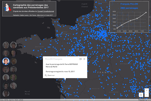 Chez Esri France, l'actualité est souvent source d'inspiration pour réaliser des cartes et démontrer les capacités de la plateforme ArcGIS. De retour du Dev Summit Esri 2017 où l'on a beaucoup parlé de développement d'applications web avec l'API ArcGIS for JavaScript 4.x, j'ai eu envie de l'utiliser pour créer une application de visualisation des parrainages des principaux candidats à l'élection présidentielle de 2017.