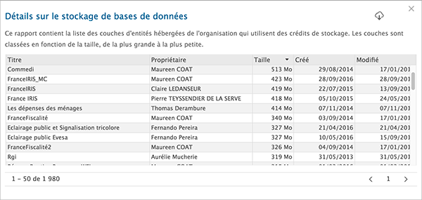 Cliquez sur le bouton "Afficher les détails de l'élément". - Une fenêtre s'affiche alors. Elle décrit en détails, pour chaque service d'entités: le titre du service, le propriétaire, la taille, la date de création et la date de dernière modification des données.