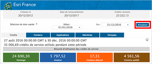Il est généralement simple de suivre la consommation des crédits pour le stockage des contenus statiques tels que les documents, les fichiers de données, les caches de tuiles, les images,... car vous connaissez leur taille et celle-ci ne varie pas au cours du temps. Pour les données de vos services d'entités (feature services) ce suivi est un peu plus dynamique car celles-ci peuvent évoluer dans le temps en terme de volumétrie. C'est le cas, en particulier, si vous activez les capacités de mise à jour sur ces données.