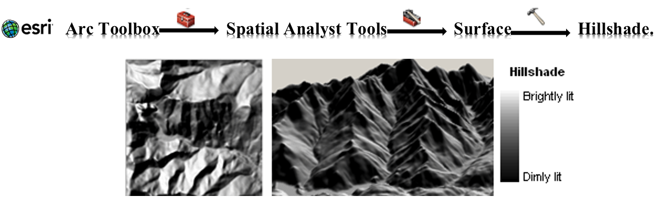 Hillshade allows us to determine the illumination of a surface (the DEM in the case) given a direction and angle of a light source (i.e. the sun). The resultant grid contains values ranging from 0-255 with 0 representing complete darkness.