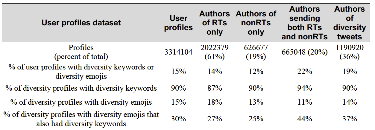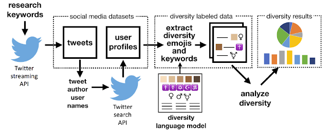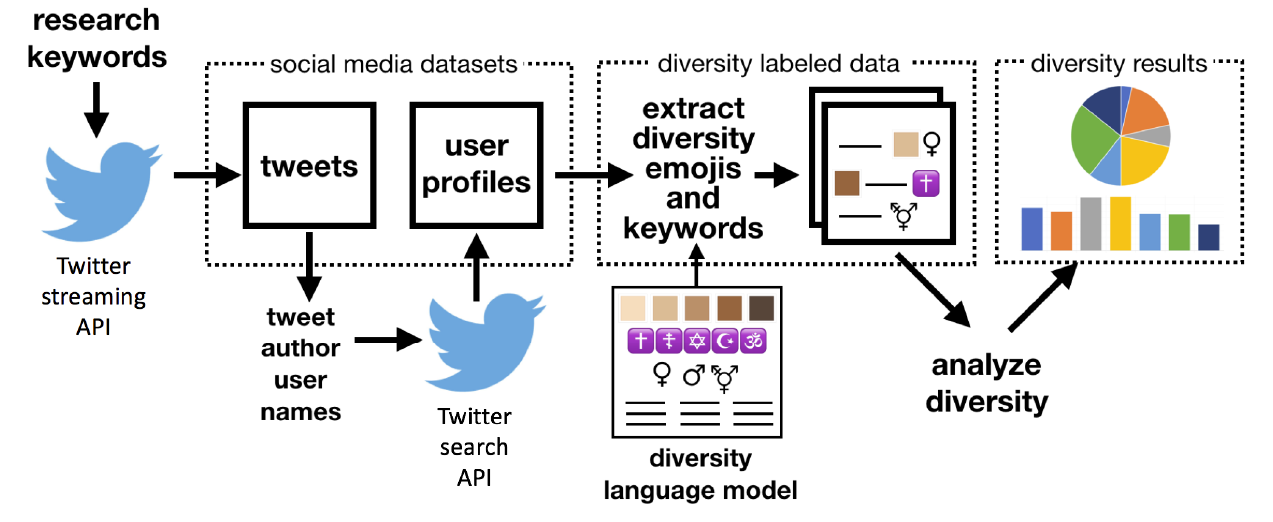 For interested readers, below we provide the abstract to the paper along with some figures from the paper. These include our workflow for diversity analysis of social media content, a high level overview of our diversity language model. These are followed by some of our results. Specifically the presence of diversity keywords and emojis in user profiles, and the composition of users in our collection based on gender for two political campaigns. If this peaks you interest as the conferce was virtual we have also prepared a short movie of the paper. While at the bottom of the post you find the full reference to the paper along with a link to the paper itself.