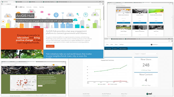 ArcGIS Hub reprend les capacités de gestion de pages et de présentation de contenus d'ArcGIS Open Data (qui est un composant d'ArcGIS Hub mais qui reste gratuit et inclut avec votre souscription ArcGIS Online). Mais ArcGIs Hub va beaucoup plus loin en proposant des modèles de pages et d'applications permettant de créer ces initiatives et suivre les contenus qu'elles génèrent, l'avancement de l'initiative, les performances du projet proposé, ... à l'aide de données (géographie ou non) sous-jacente à cette initiative. Ces modèles d'initiatives pourront être personnalisées et étendues.